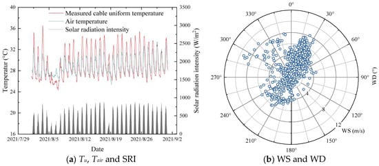 With the rapid development of sea-crossing bridges on high-speed railways (HSRs), the rate of constructing cable-stayed bridges has increased significantly in the past decade [1,2,3]. For cable-stayed bridges, cables are the primary load-carrying members. Due to long-term exposure to the atmospheric environment, bridge cables are constantly subjected to daily and seasonal fluctuations of environmental variables such as air temperature, solar radiation, and wind [4,5]. These environmental variables contribute to the change in temperature fields or thermal actions. With the increasing span and the frequent occurrence of extreme weather events, thermal actions on bridge cables become more severe, presenting challenges to bridge design, construction, and maintenance [6]. Cables are affected by thermal actions in two different ways. One is to cause the longitudinal expansion and contraction of steel wires due to uniform temperature changes [7]. The other is to induce temperature gradients along cable cross-sections. Additionally, these thermal actions can cause secondary internal forces in the cables that will jeopardize the stability of the bridge. Therefore, clarification of temperature action patterns is crucial for accurately determining the thermal effects on cable-stayed bridges.