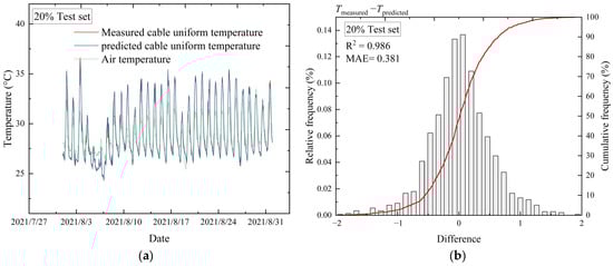 Comparison between measured and predicted cable uniform temperatures in the test set. (a) Comparison between the predicted results and the measured cable uniform temperatures. (b) Histogram for the differences between measured and predicted cable uniform temperatures.