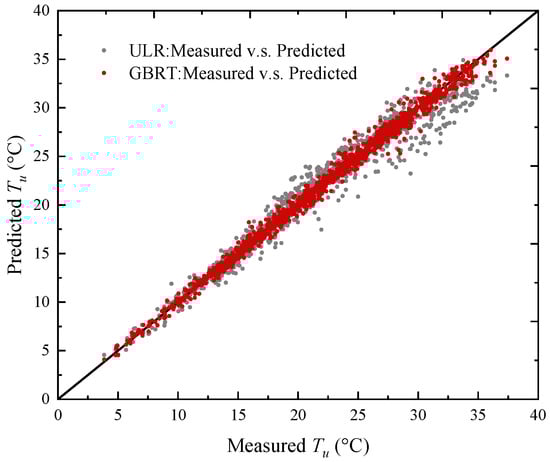 To compare the performance of the GBRT model and the conventional univariate linear regression (ULR) model, the samples in the training set are used to fit the ULR models of Tu. Air temperature is used as the predictor of the ULR models, as shown in Equation (14). The measured Tu values are compared with the predicted values using the GBRT and ULR models on the test set, as shown in Figure 22. The test R2 of the ULR model is 0.94, while it is above 0.98 for the GBRT model with multiple environmental factors as the predictors. The better prediction accuracy from the GBRT model is particularly evident for high Tu values (Figure 22).