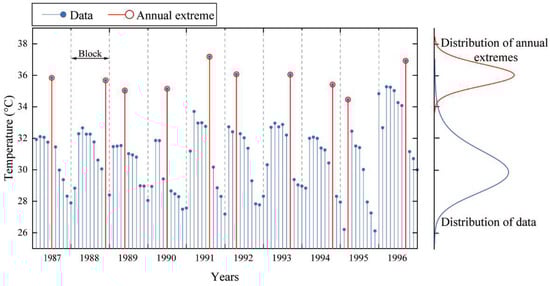 A diagram of the block maxima (BM) is given in Figure 23, where the blocks are chosen for a period of one year. According to the MaxEnt model, even if the distribution of the data is unknown, the distribution of annual extreme values can be obtained by fitting with the MaxEnt model. Therefore, the extreme values are selected from the 34 sets of data, as shown in Figure 23, followed by repeated sampling 34 times to obtain 34 annual extreme data points (Table 5). Finally, with the obtained data, the MaxEnt distribution is established, and the representative statistical extreme value of the temperature action is determined for a given return period.
