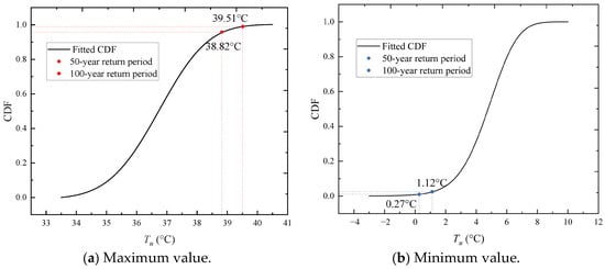 Figure 26 gives the cumulative probability function of annual maximum and minimum uniform temperatures of the cable, respectively. All the representative values of uniform temperature actions of cables are listed in Table 6. For this stayed-cable, the maximum uniform temperatures are 38.82 °C and 39.51 °C and the minimum uniform temperatures are 1.12 °C and 0.27 °C for the 50-year and 100-year return periods, respectively.