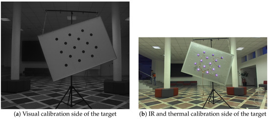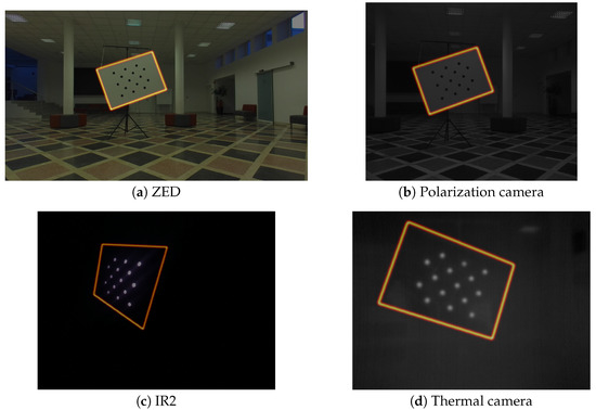 The beam-splitter approach was described by Hwang et al. [23], where the authors detailed the special hardware configuration used to acquire pixel-aligned multispectral images. The result of this approach was pixel-aligned images that were used to compile a dataset for pedestrian detection in low-light conditions. If the depth information of the observed scene is known, by using a stereo camera system along with a different modality camera, the pixels can be mapped accurately if the cameras are mounted closely together. Rangel et al. [24] used a depth camera together with a thermal camera to implement a thermal–depth fusion pipeline. They also described the difficulties of constructing a calibration target that was easily visible in both the visual and thermal spectrum. Shivakumar et al. [25] similarly combined a stereo RGB camera with a thermal camera to correctly overlap images. The authors used aluminum squares to construct a calibration pattern that was visible in both modalities. A dataset and a CNN architecture for semantic segmentation were also proposed in the same work.