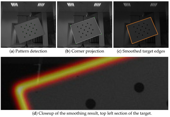 The calibration target-edges detection process. First, the pattern is detected, then the corners are projected to the image, and finally, the edges are smoothed using a Gaussian kernel.