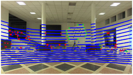 Calibration of the target edge candidates in the LiDAR point cloud. All the LiDAR points are shown in blue, the raw line segment edge points obtained by Algorithm 1 are marked with red, while the distance-filtered edge points are depicted in green. Only the points marked in green are used for the camera– LiDAR calibration.