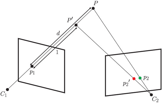 where is the calibration matrix of the first camera. This is geometrically equivalent to following the rays passing from the origin of the camera coordinate system through each of the pixel coordinates to an arbitrary distance. If the distance is set to 1, this procedure is sometimes referred to as the normalized plane (c.f. [11]). To correctly reconstruct the scene, a depth scalar needs to be applied to each of the points in ; then, the image mapping can be performed correctly as shown in Figure 7. Note that the mapping can be correct only for points whose depth corresponds to the actual depth of physical points in the scene, to prevent the parallax effect. The depth for each pixel from should be estimated as correctly as possible to produce a good mapping. Using an RGB-D camera solves this problem for closer ranges, but accurate depth information is not always available for all pixels, especially if they represent the projections of 3D scene points that are beyond the range of the depth sensor.
