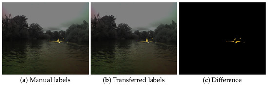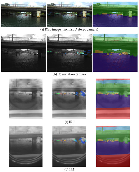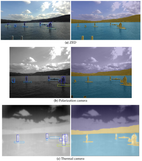 To further prove the utility of our approach, we manually annotated 15 images from each of the secondary modality cameras. Due to the high difficulty of annotating these images, we only annotated the dynamic obstacle class, as it is the most pertinent for obstacle detection as well as the easiest to manually annotate because of the clear borders between the objects and the background. The corresponding images from the ZED camera were also annotated; then, the annotations were transferred from ZED images to each of the secondary modality images. Comparison between the manual and transferred annotations was then performed by calculating the intersection over union (IoU) on all the image pixels. The average annotation transfer error for each camera modality is shown in Table 2. While the results were by no means perfect, given both the objective difficulty in annotating images captured on the water surface as well as annotating such different modalities, the results show the usability of our proposed method for transferring information between camera images in a multimodal sensor system. The difference in the average IoU values between different modalities was the consequence of those modalities being increasingly difficult to manually annotate due to the images’ visual appearance (see Figure 8). Nevertheless, following the long-established guidelines for object detection [39], which consider an IoU greater than 0.5 as a match, we claim that the results of our method are adequate and, most importantly, useful. This can be also seen in Figure 11—despite an IoU of 0.49, a very good alignment between the transferred annotation and manual annotation can be observed.