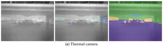 The benefits of only annotating one modality are manifold. Firstly, it requires only one pass over the data, and annotators can use rich RGB data that are easy to interpret for humans. No consolidation of multiple annotations of the same scene is required. This approach also enables the training of semantic segmentation models on each modality separately, so modality-specific models (e.g., thermal camera images for low-light navigation) can be trained. By the virtue of our camera–LiDAR calibration method, LiDAR data are also readily available as an additional data channel for every modality. If several modalities are overlaid onto a common image plane, a multispectral image can be constructed, which can help a feature extractor generalize better for single modalities as well as allow the entire model to exploit all the information provided by multiple modalities. Additionally, some modalities can be very difficult for human annotators to label, due to their unnatural appearance, lack of texture, or low resolution. This can be avoided by labeling only RGB images.