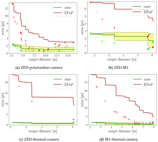 The raw and cumulative error relative to the target distance is shown in Figure 10 for both approaches. It can be observed that the EPnP approach suffered from significantly higher raw errors at small distances, reaching a minimum at some point and then increasing further with the distance. This suggests that the EPnP has problems when a strong parallax effect is observed, while our approach does not.