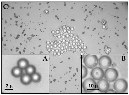 Microscope images of borosilicate glass microspheres in MS2 (A), MS10 (B), and MSMIX (C) dispersions deposited over a quartz crystal slice.