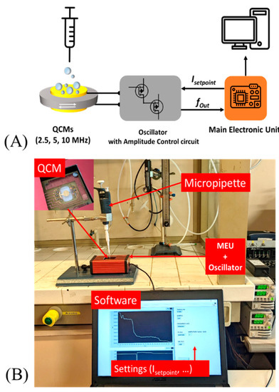 In Figure 2B, we have a photograph of the measurement setup where the highlighted QCM sensor (in particular, a 10 MHz crystal is in the photo) is connected to an oscillator circuit and to the main electronic unit, both enclosed in a single box (red one). A developed software controlled the measurement acquisitions and set all experimental parameters.