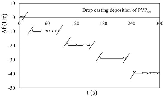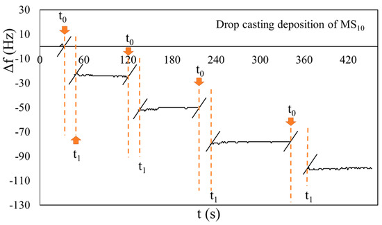 In the beginning, different depositions of the same volumes of PVPsol and MS10 on QCMs were performed to confirm the linear behavior of the Sauerbrey equation (Equation (1)). Examples of the obtained results, in the case of the 2.5 MHz crystal, are shown in Figure 3 and Figure 4. To simplify the arrangement of the plot in all chronograms shown in this paper, we have not reported the dynamic behavior of the response |Δf| during the drop-casting deposition. In fact, at the beginning of the deposition (t0), the response fluctuated between 1 and 2 kHz, and returned stable (t1) after tens of seconds. These phenomena could have been produced by the injection pressure and liquid phase of the samples. To highlight this time interval, we have introduced two oblique lines “//” in the plot, and only in the first have we indicated both t0 and t1 instants for each deposition.