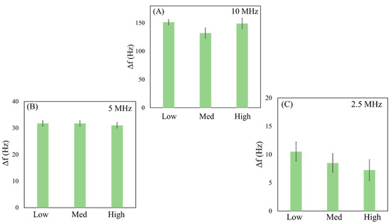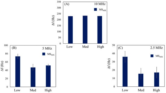 Finally, Figure 7C shows histograms of the tests performed on the 2.5 MHz QCM. The average frequency variation observed should be attributed to the 2 μm microspheres in MSMIX, because no response was observed for 10 μm particles (Dp = 10 μm > Dcrit) at high and medium levels. However, for low amplitude, the condition where Dp = 10 μm < Dcrit was observed, and 2 μm and 10 μm microspheres in MSMIX were detected together. The average frequency variations obtained from the histograms are summarized in Table 3.