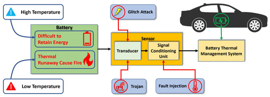 As sensors are typically low-end devices, the security issues on sensors are not considered as a high priority. Unfortunately, due to the important role of sensors in safety-critical applications, it is imperative to assure the integrity, reliability, and security of temperature sensors. For example, the safety and dependability of EVs may be jeopardized if temperature sensors are exposed to security risks. The threat analysis of the temperature sensor for electric vehicles (EVs) lithium-ion batteries is shown in Figure 1. To mitigate the problems related to temperature, EVs have one dedicated section called battery thermal management systems (BTMS) [8]. This system analyzes all thermal sensors’ data from the environment surrounding the battery and manages the thermal runaway. Temperature sensors serve as a bridge between physical quantities surrounding the battery and the BTMS. Identifying sensor malfunctions in the BTMS as quickly as possible is crucial since they might have serious negative impacts on the system.