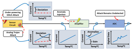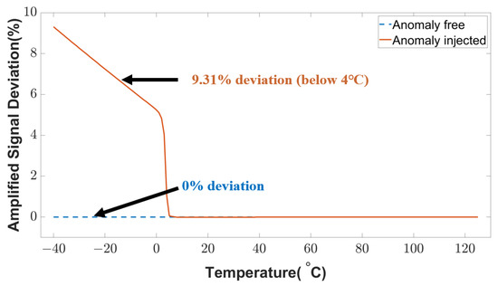 The signal conditioning unit refers to an amplifier circuit that introduces a certain gain to the signal from a transducer unit. An attacker can inject anomalies into this amplifier unit to modify the original data. This attack could lead to faulty sensor data at the user level. The anomaly-injected and anomaly-free conditions are shown in Figure 15. When the fault is not triggered, the amplified signal deviation is close to 0%. However, the deviation goes up to 9.31% in the case of triggered fault at low temperatures (below 4 C). Any autonomous temperature-dependent system will receive an anomalous signal in this low-temperature region that deceives the temperature control mechanism and creates malfunction in the application.