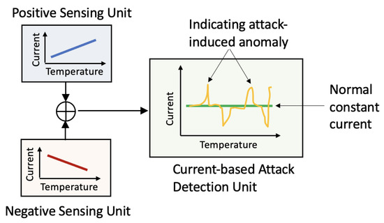 The attack-resilient attribute of the proposed secure transducer is achieved by integrating two sensing circuits, which are either positively or negatively proportional to the temperature. As shown in Figure 4, the current-based attack detection unit integrates the output from the positive and negative sensing units. Then, the detection unit examines the current vibration to generate a warning signal. Without sensor attacks, our current-based attack detection unit maintains a constant current. In contrast, current glitches indicate an attack on the transducer unit.