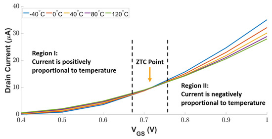 To be compatible with the other digital modules, we used MOSFETs to implement the positive and negative sensing units in Figure 4. A diode-connected MOSFET operates in its saturation mode, in which the drain current is determined by the applied gate-source voltage . As temperature variation changes the transistor threshold voltage, the drain current varies with temperature. Figure 5 depicts the impact of temperature and on the drain current of a diode-connected MOSFET. As can be seen, the drain current decreases with the increasing temperature in Region I (i.e., positively proportional relationship); in contrast, a higher temperature leads to more drain current in Region II (i.e., negatively proportional relationship). Between Region I and Region II, a Zero Temperature Coefficient (ZTC) point exists, at which the transistor’s mobility and threshold voltage are mutually compensated in a certain range of temperatures. Thus, the transistor is resilient against temperature variation.