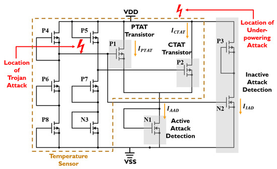 We leverage this complementary current–temperature dependency to design an attack-resilient temperature sensor circuit, as shown in Figure 6. The transistors P1 and P2 operate as two sensors, the current of the P1 transistor is positively proportional to the absolute temperature (PTAT) and the current of the P2 transistor is complementarily proportional to the absolute temperature (CTAT). The PTAT and CTAT transistors have a linear dependency between carrier concentration and temperature. The transistor N1 combines the currents from PTAT and CTAT to form a constant current reference for active attack detection. The constant current reference holds some variation with temperature. The impact of temperature on current variation is minimized by tuning the MOSFETs aspect ratio. To detect inactive attacks, an extra branch composed of the P3 and N2 transistors is introduced to draw a significant amount of current, even if there is a slight change in the voltage. The rest of the transistors in the sensing circuit are responsible for providing the proper gate voltages for the PTAT and CTAT transistors, as well as active and inactive attack detection circuits. The proper for the PTAT and CTAT transistors is determined from the observation shown in Figure 5. Furthermore, we exploit the principle of temperature compensation [26] to reduce the dependency between and temperature.