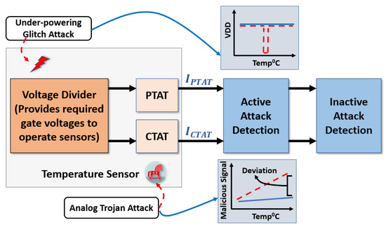 Due to limited resources to authenticate the source of signals, sensors typically cannot tolerate intentional or unintentional interference (such as a fault attack) [9]. Security threats on sensors are typically managed at the system level. Sensor fusion [10] relies on system-level statistics to detect anomalies in the overall system. Fuzz testing and validated security patches capture the system anomalies, but they cannot identify a transduction attack that provides false sensing data [11]. A sensor network redundant system [12] is introduced to detect the inconsistency among multiple sensors. A structural analysis-based sensors fault detection method [13] generates sequential residuals to detect and isolate current, voltage, and temperature sensor faults. The residuals are evaluated by a statistical inference method for more accurate decisions. A study [14] proposed a sensor fault detection strategy based on a data-driven method and optimized by utilizing five different machine learning methods. Although these systems can accurately detect stealthy attacks with a short detection time, sensor-level detection is still needed to identify the attack location. System-level solutions do not differentiate the root causes and thus treat various attacks with the same recovery procedure, sometimes incurring unnecessary overhead. Attack mitigation from a high level will fail to meet the real-time requirement of practical applications. Moreover, some existing works designed temperature sensors only assuring reliability at the circuit level. A transistor-based current-mode thermal sensor [15] leverages subthreshold NMOS transistors to meet power requirements with a robust architecture. To mitigate the sensitivity to the subthreshold factor variability, a simple voltage-based single-point soft-trimming was implemented. A complimentary current-mode approach [16] using a single feedback loop is introduced to design a compact thermal sensor. A fully integrated temperature sensor [17] utilized the difference between a reference current source and a proportional to absolute temperature current source to generate a linear temperature-dependent frequency. The reliability of this design is ensured by using a process compensator switch to the architecture. A recent work [18] presented a bandgap reference voltage source for a sensor system-on-chip by combining the high stability of the traditional BJT bandgap reference and the low power characteristics of the sub-threshold bandgap reference. However, a reliable integrated solution is required with fault detection capability for the sensor network connected to the system.