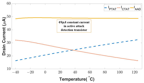 The performance of sensors typically varies with the fabrication process. We examined the constant characteristics of the combined current from the PTAT and CTAT sensing branches in three process corner cases (i.e., typical-typical, fast-fast, slow-slow). The current deviation is a metric (Equation (12)) to indicate the impact of process variation on attack detection sensitivity.