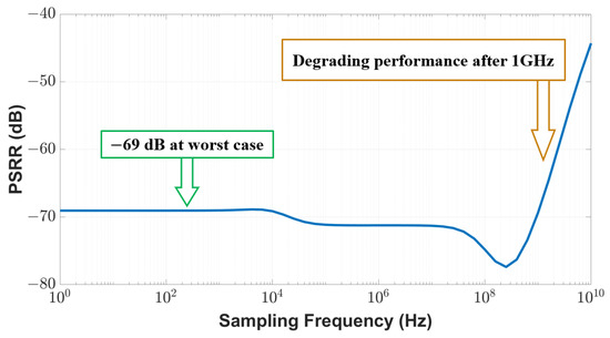 where is the supply voltage connected to the proposed temperature sensor and is the output voltage at the sensor node. A higher PSRR (absolute value) indicates better sensor performance. As shown in Figure 11, our sensor achieves a PSRR of −69 dB within the 1 GHz range, which is 11% better than the performance reported in the existing work [29]. As the sampling frequency goes beyond 1 GHz, the PSRR performance of our sensor will degrade.