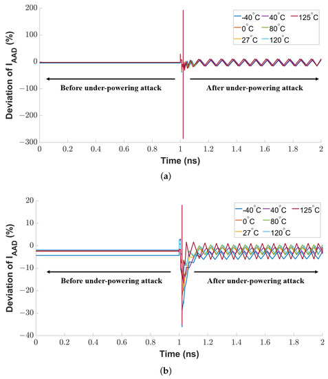 As explained in Section 4.2, the current of the active attack detection transistor in the proposed sensor remains constant in normal conditions. Any vibration on that current can indicate an anomaly in the sensor. We use the current deviation as a metric to evaluate the attack detection sensitivity. At first, we conducted an under-powering attack on the sensor circuit by attaching an additional power source to the supply pin (VDD) of the CTAT or PTAT transistor to pull down its nominal supply voltage from 1.8 V to 0.8 V with a time interval of 100 ps. As shown in Figure 12a, there is a sharp spike at the rising edge of the voltage glitch because the attack breaks the stable conductive channel between the drain-to-source terminal of the sensing MOSFET. The peak vibration range of the spike is 284.9%. After the attack duration, the residual vibration (in a range of 42.85%) remains in the current deviation.