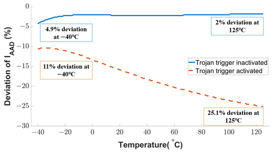 Another intentional fault attack examined in this work is analog Trojan [23]. The Trojan payload adds an extra voltage to the sensing transistor’s gate voltages, and an external source or clock voltage triggers the analog Trojan. The Trojan-induced current deviation of the active attack detection transistor is shown in Figure 13. If the Trojan is not activated, the current variation is negligible (4.9% at the temperature of −40 C and 2% as the temperature increases to 125 C). Once the analog Trojan is triggered, the current deviation starts from 11% and reaches up to 25.1%. The temperature plays an important role here because a higher temperature results in higher mobility of the charge carriers. Compared to the Trojan inactive mode, the current deviation due to the Trojan activity will be 2.2× at −40 C and 12.6× at 125 C. This substantial current deviation can be used to detect Trojans effectively.