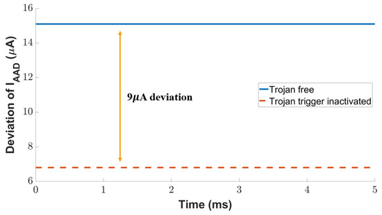 We further exploit the current of the inactive attack detection branch to detect the Trojan even if it is not activated. The diode-connected load in the inactive attack detection circuit draws a large current with a small increase in voltage change. As shown in Figure 14, there is a current difference of 9 µA between the Trojan-free and Trojan-inactive scenarios. The current reduction caused by the inactive Trojan is 55% variation with the golden circuit current, which is 11× to the current monitored by the active attack detection transistor discussed above. In summary, the two current monitoring branches in our attack-resilient sensor provide a high sensitivity against the Trojan, no matter whether it is active or not.