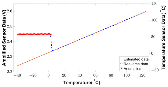 We applied a statistical method (Z-score) to detect the anomalies from the real-time sensor data. This method can detect anomalies at low temperatures. The anomaly detection from the signal conditioning unit is shown in Figure 17. The BTMS receives the alarm signal for anomaly detection to isolate a certain temperature sensor module. As shown in Figure 17, the anomaly injection changes the lower temperature readings (−40 C to 4 C) to a higher temperature (around 50 C). This faulty temperature reading deceives the BTMS to operate in lower temperatures. When anomalies are detected, the alarm alerts the BTMS of an EV. In this way, the BTMS will isolate a specific sensor module according to the alarm.