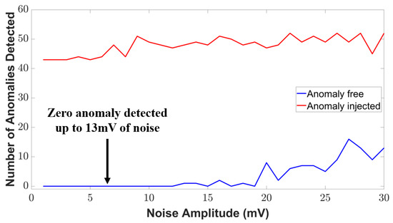 where NDC represents the number of anomaly points detected correctly and NR represents the number of real anomaly points. Our case study shows that the anomaly detection rate is about 97.73% found from the signal conditioning unit. The detection rate has been significantly increased compared to our reference works [14,31,32]. However, all the electronic unit, such as the transducer unit, has some environmental noise [33]. These noises are being amplified in the signal conditioning unit, which can jeopardize the secured architecture and send false alarms to the BTMS. As a result, we consider the noise magnitude in our simulation to examine the noise tolerance of our method. The variation in anomaly detection with the noise is shown in Figure 18. As can be seen, zero anomalous data are detected up to 13 mV of the noise amplitude in the anomaly-free condition. We observe some anomalous detection after the 13 mV noise amplitude which defines the noise tolerance level of our proposed security method in signal conditioning units. If the noise level exceeds more than 13 mV, this method might give a false alarm and mislead the BTMS.