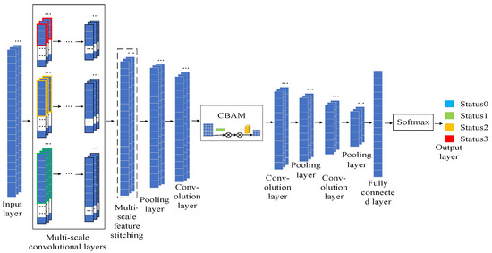 The structure of the rotating machinery health recognition (MSCCNN) model is shown in Figure 3. Firstly, a multi-scale convolution layer is built to extract multi-scale features under the different field of view sizes. Secondly, the mixed features after multi-scale convolution are spliced and fused, convolved, and pooled to obtain higher level features. The features are input to the attention mechanism module (CBAM) to complete adaptive feature extraction, and the extracted features are convolved and pooled again to extract more abstract features. Finally, the output of the classification results is performed through a fully connected layer, and the model parameters are optimized by improving the loss.