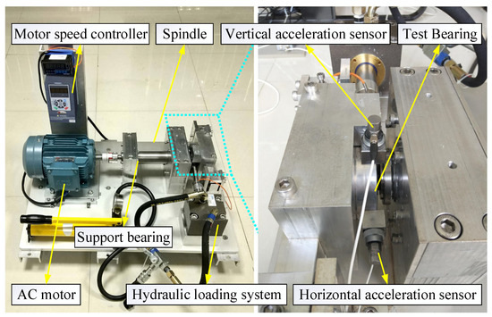 In this paper, the effectiveness of the proposed method is verified using accelerated life test data of XJTU-SY bearing, and the experimental bench consists of an AC motor, speed controller, rotating shaft, support bearing, and test bearing [29]. The experimental data consisted of failure data of 15 bearings in total for three different operating conditions. The accelerated life experiment platform of rolling bearings of Xi’an Jiaotong University is shown in Figure 6, and the bearing data information is shown in Table 3.
