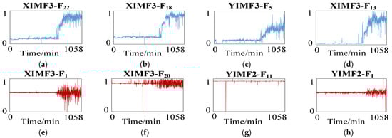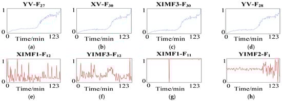 A total of 12 features are extracted in the time domain, among which the dimensioned features include mean, variance, standard deviation, maximum value, minimum value, peak-to-peak value, root mean square value, absolute mean value, and square root amplitude, the dimensionless features include waveform indicator, peak indicator, and pulse indicator, whose expressions are shown in Table 1. For the convenience of experimental statistics, the time domain features extracted from the original vibration signal in the X direction are called XV-F1 to XV-F12, and the time domain features extracted from its first order IMF components are named XIMF1-F1 to XIMF1-F12. The naming of the time domain features extracted from the second and third order IMF components is the same as that of the time domain features extracted from the first order IMF components.