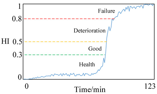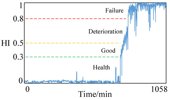From the figure, it can be seen that the good characteristic curves in the multi-scale hybrid features have obvious monotonicity, which can well characterize the degradation status of the reducer with time. The health state index of the reducer constructed by multi-scale hybrid features selection and KPCA dimensionality reduction is shown in Figure 15.