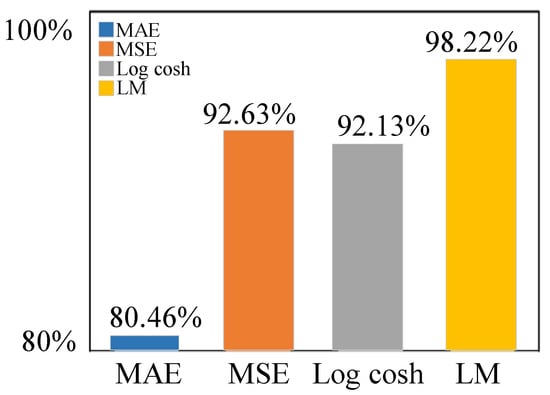 The loss function is a non-negative real-valued function that measures the degree of inconsistency between the predicted and actual values of the model. The smaller the value of its loss function, the better the robustness of the model. Convolutional neural networks use an error backpropagation algorithm to train the model. The MSCCNN model in this paper uses the “MAE,” “MSE,” and “Log cosh” loss functions and a modified custom loss function (LM) to perform the test. The “LM” loss function combines the advantages of the “Log cosh” and “MSE” loss functions and avoids their respective disadvantages. The improved custom loss function (LM) formula in this paper is: