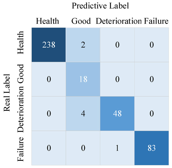 The health status identification of the reducer by the method of this paper, the sample classification and the identification results confusion matrix are shown in Figure 16, and the specific data is shown in Table 11.