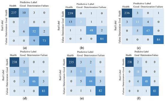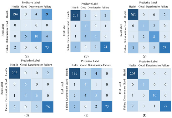 Identification method confusion matrix results in reducer data set. (a) SVM; (b) CNN; (c) CNN + CBAM; (d) MSCNN; (e) MSCCNN + conventional features; (f) MSCCNN.