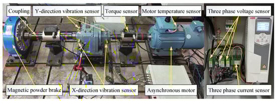 A rotating machinery (reducer) experimental platform is built to verify the effectiveness of the proposed method. The laboratory platform mainly consists of a magnetic powder brake, a gear reducer, an AC motor, a shaft coupling, and various sensors. Vibration, speed, temperature, and other sensors are installed to collect signals during the operation of the reducer. The specific types of sensors and their installation locations are shown in Figure 13.