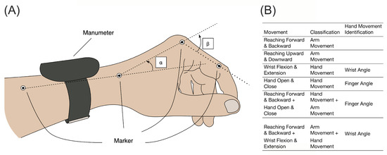 (A) Marker placements for inferring the wrist and finger angle. represents the wrist angle. Additionally, represents the finger angle (i.e., metacarpophalangeal joint angle). Four markers were taped as shown in the figure to the wrist and finger to obtain and . (B) The list of movements in the Mocap-Lab Dataset. Subjects performed 6 movements involving an arm-only movement, hand-only movement, and hand and arm movement.