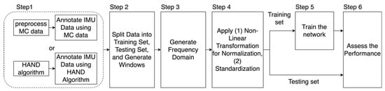 We used 6 steps to annotate and preprocess the datasets and to train the network (Figure 2). We used 9 features in training the network: 3-axis acceleration, 3-axis angular velocity, and the 3-axis gravity direction. Note that we subtracted gravity from the acceleration and obtained gravity direction through the Madgwick filter [14]. In Step 1, we annotated these datasets using either the motion capture system or the HAND algorithm. In Step 2, we split data into training and testing sets (see details in the Section 2.5). Then, we generated windows with 150 samples (i.e., about 2.85 s of data), which served as inputs for the training and validation datasets. For the training set, these windows were generated with a stride of 50-time samples (about 0.95 s of data). We labeled a window as positive if at least a one-time sample was designated as positive for a hand movement within the last 50-time samples of that window. We adopted this approach to provide the network with an adequate context to determine if a hand movement had taken place, i.e., the network evaluated a window of 150-time samples to predict if a hand movement took place in the last 50-time sample in that window. As a result, for every 50-time samples, we assigned a label of either positive or negative for hand movement occurrence and defined these 50-time samples, as well as the previous 100-time samples, as the “data-sample” for performing identification (see Figure 3 for an example of a data-sample). In Step 3, we converted the samples of raw sensor signals for each data sample into spectrograms by applying a Short-Time Fourier Transform (STFT). In Step 4, we applied a non-linear transformation and the Box–Cox transform [15,16,17,18]) to the spectrogram variables for normalization, which we found to improve network performance. During the generation of the training set, the parameter for the Box–Cox transform was selected using a SciPy scalar optimizer [12]. After this normalization, we applied standardization by subtracting out the mean and dividing by the standard deviation. Further details can be found in the Supplementary Materials.