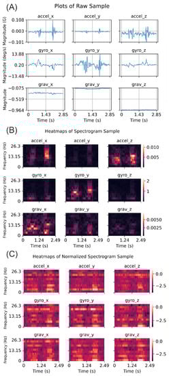 An example of processing a data-sample where the HAND algorithm predicted the existence of a hand movement. This data-sample contained 150 time-samples from the IMU. (A) Acceleration, gyro, and gravity vector measures are shown in each row as a function of time, with the columns indicating the x, y, and z axes of the sensor. (B) The heatmaps of the spectrograms computed from this sample for each measurement. (C) The heatmaps of the normalized spectrograms.