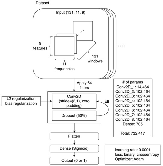 In Step 5, we trained a Convolutional Neural Network (CNN): a network architecture often used in image recognition tasks (Figure 4) [19]. Spectrogram classification can be effectively executed with CNNs [20], and there are various studies available on the application of spectrograms for classification tasks, specifically within the realms of voice [21] and human activity recognition [22]. The CNN we used consisted of 7–8 repeated convolutional layers with L2 regularization and dropout layers. The dropout layers were inserted to avoid overfitting [23]. A sigmoid activation function was used to output the final predicted probabilities. For the loss function, we used a binary cross-entropy loss function with an Adam optimizer [24].