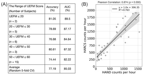 We divided the 20 stroke subjects into groups according to a standard clinical measure of UE movement ability: the UEFM Score. For reference, a UEFM score of less than 20 means severe UE paresis, a score of 30–40 means that a hand function is just emerging; and a score of 66 means normal movement ability [33]. HARCS accuracy was 81% for the two subjects in the range of 0–20 for the UEFM score and 74% for 15 subjects in the range of 50–60; that is, the accuracy varied by 7% for the level of hand impairment (Figure 5A). Across all participants, using a random 5-fold CV, the average accuracy was 77%. Further, the number of HARCS counts identified across a day ’s worth of wear time was strongly correlated with the number of HAND counts, which were the counts identified in the previous study that used additional information from a magnetic ring instead of just IMU data (r = 0.874, p = 0.00, R2 = 0.763) (Figure 5B).