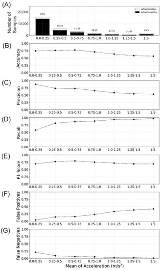 The relationship between the network performance and the mean linear acceleration across the data-sample window of duration ~2.8 s. (A) Number of data samples segmented by mean acceleration. (B–E) Performance metric segmented by the mean acceleration. (B) Accuracy. (C) Precision, (D) Recall. (E) F1-score. (F,G) Proportion of classifications segmented by the mean acceleration. (F) False positive rate. (G). False negative rate. In (A), the proportions of actual positives and total data-samples are shown on the top of each bar.
