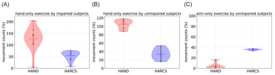 Comparison of HARC algorithm counts versus HAND counts and the true number of hand movements for (A) Hand-only exercises by people with a stroke (B) Hand-only exercises by unimpaired subjects, (C) Arm-only exercise by unimpaired subjects. For (A,B), perfect counting resulted in 100% movement counts. For (C), perfect counting resulted in 0% movement counts, since C was arm-only exercise. A value of 100% represents 50 hand movements for the hand-only exercise and 200 movements for the arm-only exercise.