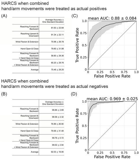 (A,B) Average accuracy of HARCS when trained and tested on the Mocap-Lab Dataset obtained from nine unimpaired subjects. (C,D) The mean of the ROC Curve (solid line) in which the shaded area represents 1 standard deviation. In (A,C), combined hand/arm movements were treated as an actual positive. In (B,D), combined hand/arm movements were treated as an actual negative.