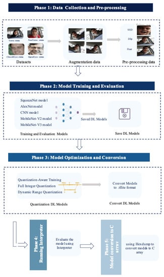 This section describes the proposed methodology of the study’s experiment on the driver drowsiness detection case using the TinyML (DDD TinyML) model. The aim is to detect driver drowsiness using small deep-learning models. The methodology’s workflow has several phases, with each phase linked to the next phase. Figure 1 illustrates the implementation phases of the proposed method, while details of the implementation are described below:
