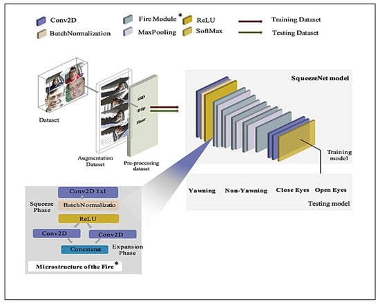 The SqueezeNet deep model is selected in this study as it is a lightweight, efficient model. The main aim of the SqueezeNet deep model is to produce architecture with few parameters while maintaining competitive accuracy, hence, producing a lightweight deep learning model [58,59]. The current study modifies the original SqueezeNet model architecture so it is lighter than the original model while maintaining accuracy to be able to detect driver drowsiness. The authors in [59] have called the Fire Module nine times, while in our research, it is called only five times. Also, a modification has been done by deleting the batch normalization and adding expanded layers to the activation function. The basic idea of SqueezeNet model architecture is a Fire Module that comprises a squeeze convolution layer with only a (1 × 1) filter, feeding to an expanded layer that has a mix of (1 × 1) and (3 × 3) convolution filters, as shown in Figure 3. The ReLU activation function is included with each layer. The SqueezeNet model architecture first comprises a stand-alone convolution layer with input shape (192 × 192 × 3), followed by a BatchNormalization layer and the ReLU activation function. MaxPooling layers with strides equal to two values come after each of the five Fire Modules. The model is completed with a GlobalAveragePooling2D layer and a Dense layer with SoftMax activation function to detect driver drowsiness status, as illustrated in Figure 3. Table 2 illustrates the SqueezeNet model architecture and the number of parameters. The parameters total 118,900, which are split into 118,420 trainable parameters and 480 non-trainable parameters.