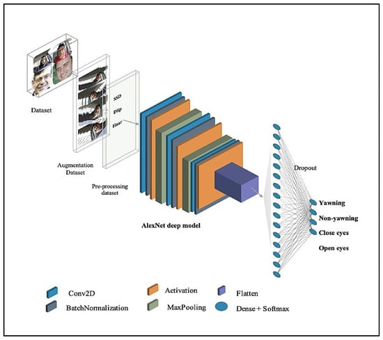 Several types of supervised deep learning models are developed in the current to detect driver status, namely, yawn, non-yawn, closed eyes, and open eyes, aiming to obtain the best performance. The current study develops five small, lightweight deep models while preserving their performance. The deployment devices experience size constraints after performing a large amount of experimentation on the architecture of several deep models and comparing their performance. The three deep models are developed, namely, SqueezeNet, AlexNet, and CNN, with the study adapting two pre-trained models, namely, MobileNet-v2 and MobileNet-v3, that are pre-trained on the ImageNet dataset. The following subsections describe the architecture of the deep models used in the experiment.
