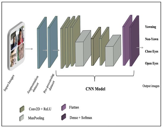 The convolution neural network (CNN) deep model is designed to classify and analyze visual data. Overall, it has shown effective results with pattern identification and the problem of feature extraction [61]. In the current study, the CNN deep model is proposed for detecting driver drowsiness status while maintaining model size with performance. The CNN model architecture comprises of input layer that receives input images in four categories (145 × 145 ×3). Three 2D convolutional layers consist of the learned kernels (weights), the extracted features that differentiate different images from one another, and ReLU, the activation function. In addition, two layers of the MaxPooling type are added between 2D convolutional layers, with the pool size set to 2 and padding having a valid value. The outputs of the convolutional layers are passed to flatten the layer, transforming the shape of data into a one-dimensional (1D) data vector. The final layer is an output layer, namely, a Dense layer that contains the SoftMax activation function for detecting driver drowsiness states, namely, yawn, non-yawn, closed eyes, and open eyes). The proposed architecture of the CNN model can be seen in Figure 5. The parameters in the CNN model total 46,574, with all parameters being trainable parameters with zero non-trainable parameters. Trainable parameters are the parameters which are updated during the training process to obtain optimal values. However, non-trainable parameters are not updated and optimized during the training process: as a result, they do not contribute to the classification process. Table 4 shows the CNN model architecture and the number of parameters.