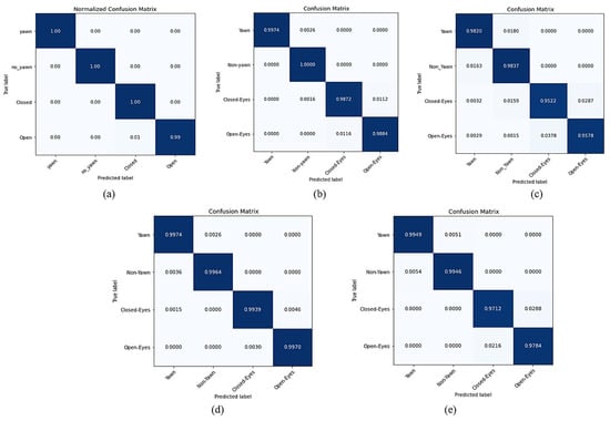 The driver’s status ranges between drowsiness and non-drowsiness, with the drowsiness status showing signs such as yawning or closed eyes. In contrast, the signs for a driver in the non-drowsiness or awake status drivers are non-yawning or open eyes. In this research, two datasets are accessed and collated for the experiment to detect the driver’s status. The first dataset is the yawning detection dataset (YawDD) [50], which provides videos of drivers sitting in the driver’s seat with different mouth expressions, such as normal, talking, and yawning. The videos are taken in real conditions with varied illumination. The dataset contains videos of 107 participants: 57 males and 50 females of different ages and ethnicities and with different facial characteristics. Furthermore, videos are taken of participants wearing prescription eyeglasses, wearing sunglasses, and without glasses. The current study uses a dataset from Kaggle [51], which converts the YawDD videos into images. The dataset includes two categories of driver status, namely, yawn and non-yawn, with the non-yawn status including normal status and talking status. The second dataset is the Closed Eyes in the Wild (CEW) dataset [52], which contains 2423 male and female subjects with closed and opened eyes, as well as some wearing prescription glasses and some without glasses.
